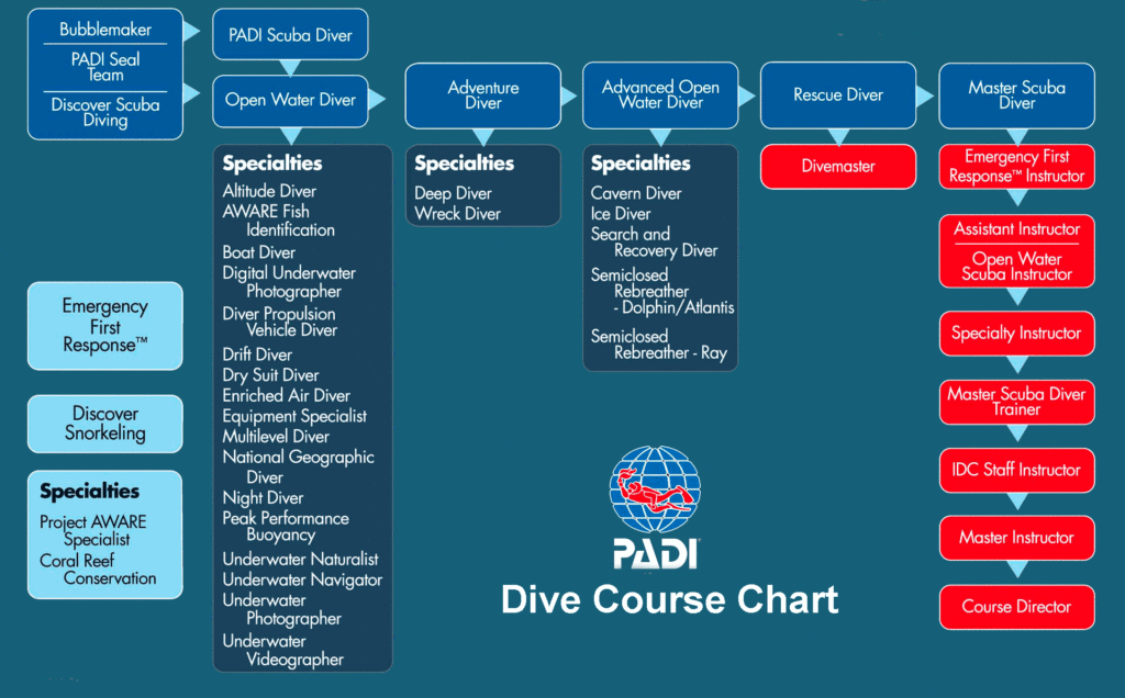 – Open Water Diver (Plongeur Encadré 18m) ce cours est articulé en 7 plongées, 5 chapitres théoriques et une évaluation , possibilité d’être réalisé en 4 jrs minimum ou plus en fonction de votre disponibilité,