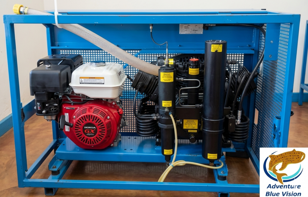 Le gonflage est réalisé par un compresseur Coltri 13 m3 avec une rampes de 3 sorties, 230b, Chez Adventure Blue Vision, vous trouverez tout l’équipement nécessaire pour faire de vos plongées des moments inoubliable !! !